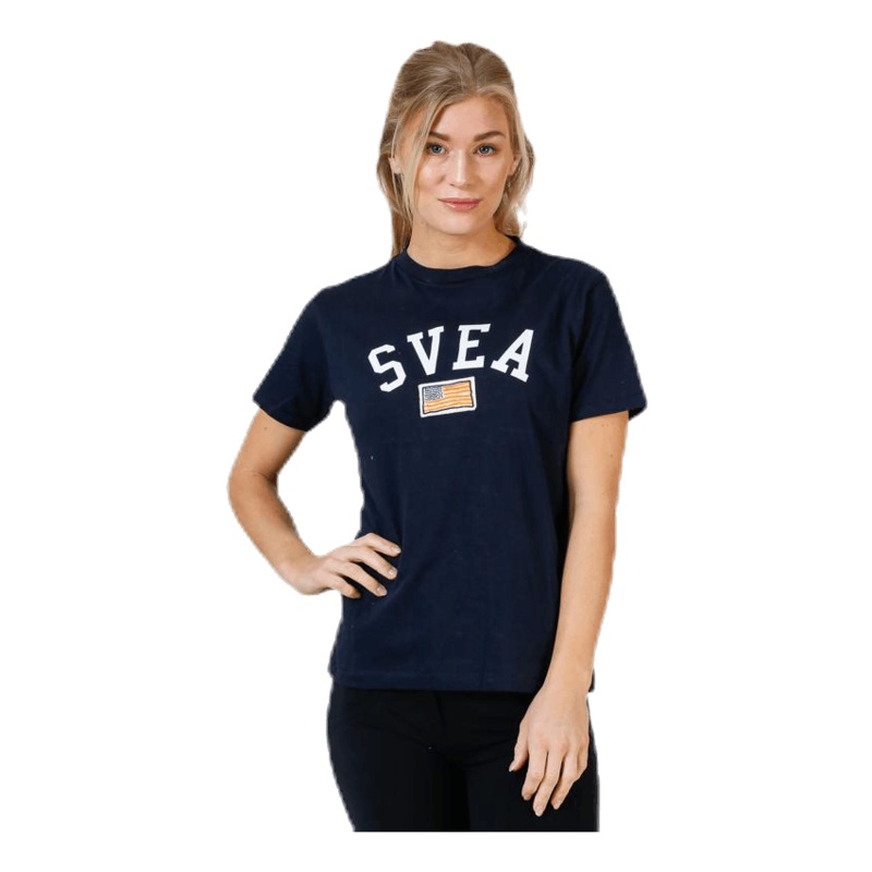 Bekvm t-shirt med rundad halsringning och har stor rundad printad svea logga och agga mitt p brstet.