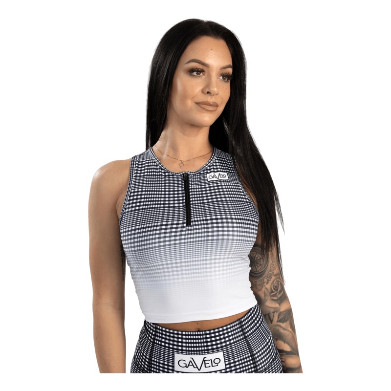Toppen GLNCHCK 5 White har ett klassiskt rutigt mnster med hg hals och dragkedja. Med en inbyggd sport-bh ger den ltt std och en perfekt passform, som blandar aktuellt mode med funktionalitet.