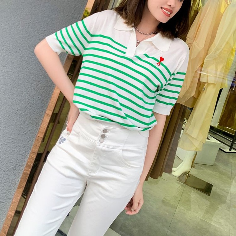 Summer Short Sleeve Stripe Polo Sweater Knitwear