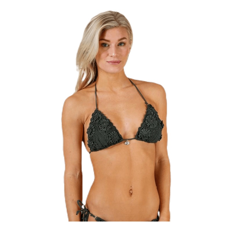 Trekantsbikini verdel med mnster av virkade blommor i ssongens frg. Uttagbar vaddering, halterneck med silvrigt logohnge mellan kuporna. Passar dig med A-, B-, C-, eller D-kupa. Har du D-kupa rekommenderar vi dig att vlja en strre storlek.