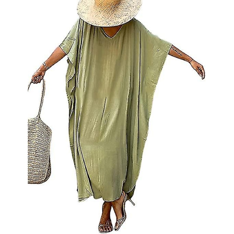Description Baoji en vedette.Features: Spacious and loose summer dress design, simple and fashionable Baoji en vedette.Soft and light rayon fabric, comfortable and breathable, sexy V-neck, side slit hem of kaftan home dress for a more feminine look Baoji e