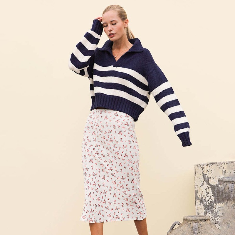 Lapel Long-Lleeved Striped Knitted Loose Casual Versatile Slim Sweater Womens Clothing – Color Contrast Element and Fashion Top price
