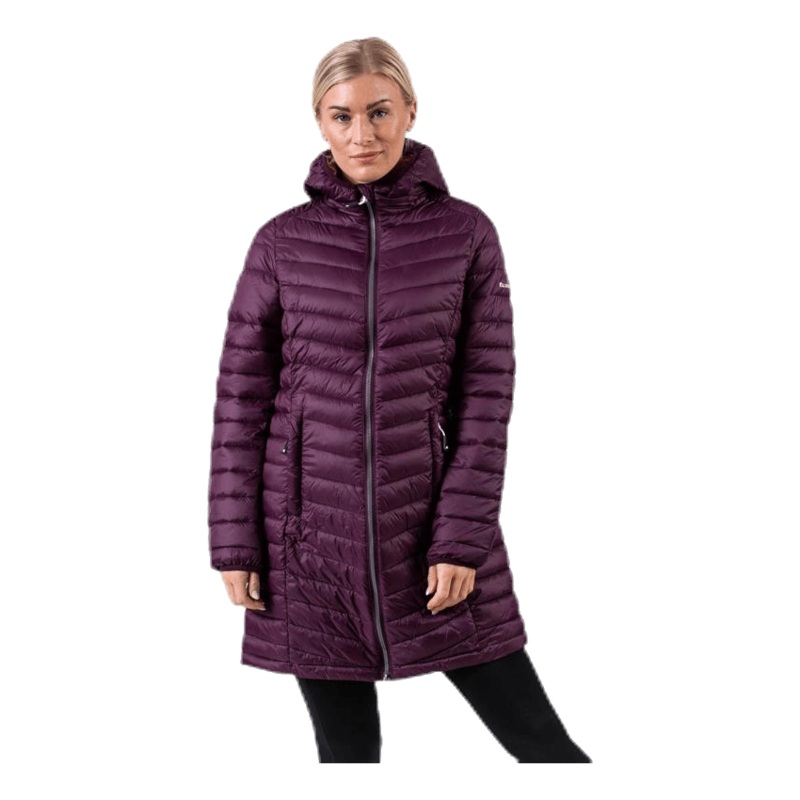 Lttviktsjacka fr dam i lng modell. Jackan r vattenavvisande och fylld med imitationsdun. Huvan kombinerat med jackans lngd bidrar till ett gott skydd mot vder och vind. Tv stycken blixtlsfrsedda fickor. Resrband i rmslut och huva fr god passform.