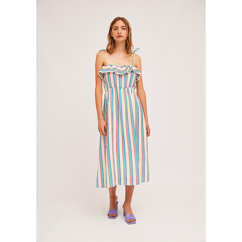 Midi dress with thin multicolour stripe print. Ruffled straight neck. Thin adjustable bow tie straps. Elasticated waist. Below-knee length. Inner lining. Model is wearing size S. COMPOSITION: 100% viscose. | CARE: Machine wash cold water, do not bleach, do not tumble dry, do not iron, wash dark colours separately.