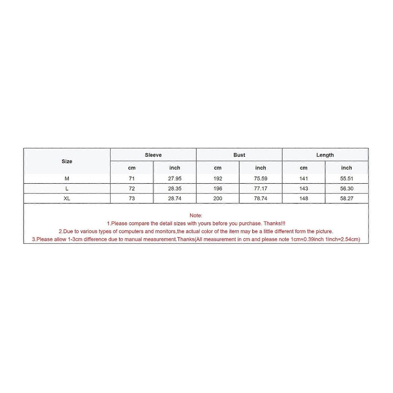 Size:XL Sleeve:73cm(28.74inch) Bust:200cm(78.74inch) Length:148cm(58.27inch)