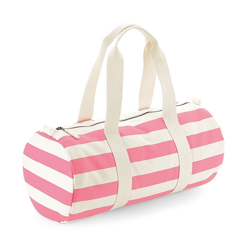 Horizontal stripes continue to influence the high street, and this Nautical Barrel Bag is a key holiday piece for fans of the maritime stripe design. Created using a soft brush cotton canvas and fashioned with comfortable webbing carry handles. This classi