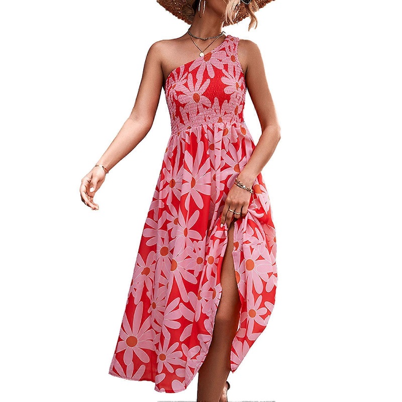 Item Type: One Shoulder DressMaterial: 95% Polyester Fiber, 5% PolyurethaneWashing Guidelines: Hand or Machine WashClosure: Concealed zip closureStyle Characteristics: Midi dress, one shoulder, floral print, shirred design. Casual dresses. The fabric is light and comfortable.Applicable Scene: Suitable for summer and autumn daily wear, leisure, beach, vacation, dating, shopping, etc.Size: S: Length: Approx. 123cm / 48.43in, Bust: Approx. 64cm/25.20in, Waist: Approx. 64cm / 25.2in, Weight: Approx. 195g / 6.9ozM: Length: Approx. 124.5cm / 49.02in, Bust: Approx. 68cm/26.77in, Waist: Approx. 68cm / 26.77in, Weight: Approx. 205g / 7.2ozL: Length: Approx. 126cm / 49.61in, Bust: Approx. 72cm/28.35in, Waist: Approx. 72cm / 28.35in, Weight: Approx. 215g / 7.6ozXL: Length: Approx. 127.5cm / 50.20in, Bust: Approx. 76cm/29.92in, Waist: Approx. 76cm / 29.92in, Weight: Approx. 225g / 7.9oz