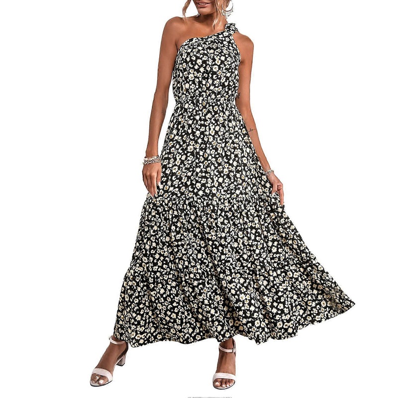 One Shoulder Sleeveless Floral Dress Summer Knot Ruffled Hem Flowy Bohemian Maxi Floral Dress for Girls Women Black L | Fruugo SG