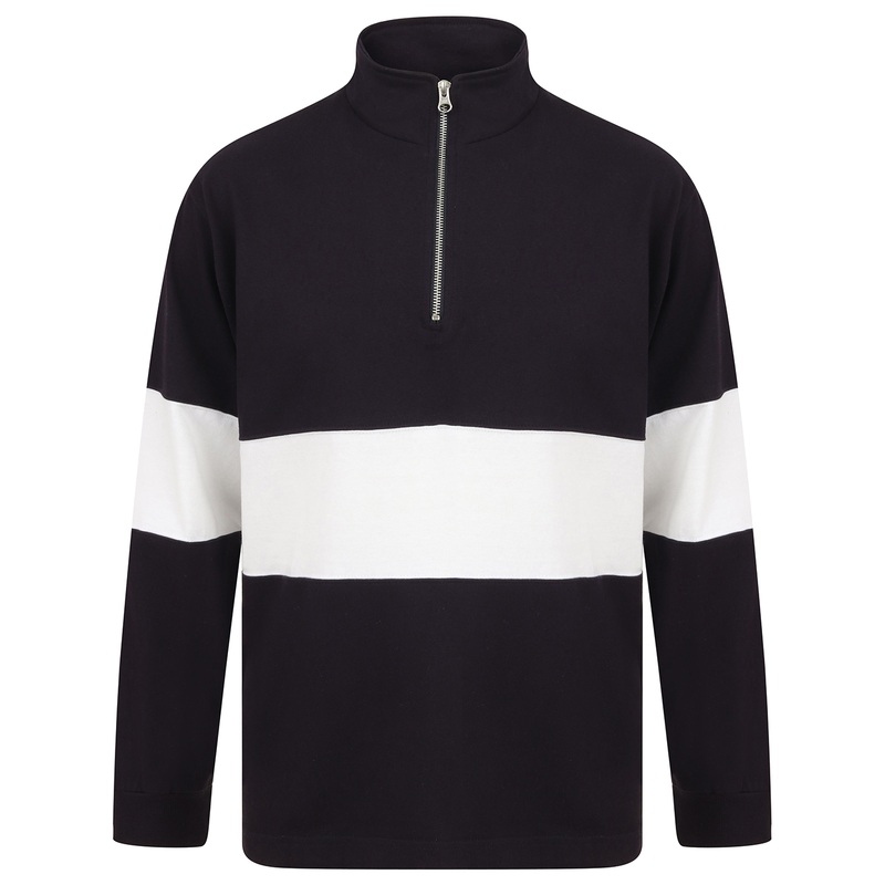 This tag free 1\/4 Zip from Front Row and Co. is perfect for everyone from fashion brands to traditional clubs. Made from high quality heavyweight Jersey, this on-trend panelled top has a self-fabric funnel neck, YKK silver metal zipper and stepped hem. Tag free and ready to display a bold slogan, logo or crest. The front row in rugby; the front row in fashion.