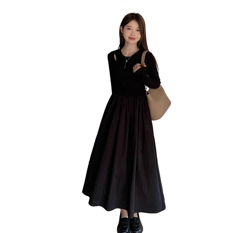 Style,crew neck,high waist,cut out,long sleeve,patchwork a line long dress