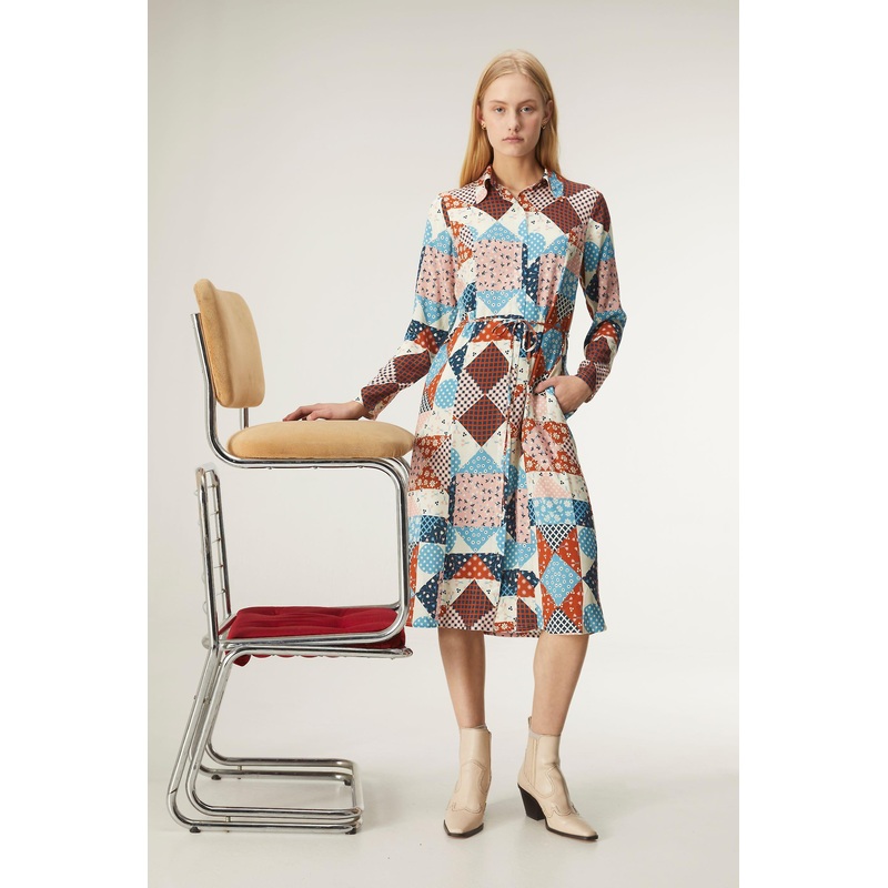 Description COMP-23C-COMP-23C-41005 Midi shirt dress with patchwork printin sustainable fabric with LENZING ECOVERO fibres. Shirt collar and long sleeves. Front buttons and belt. Model is 173cm tall and wears size S. LENZING and ECOVERO are trademarks of L