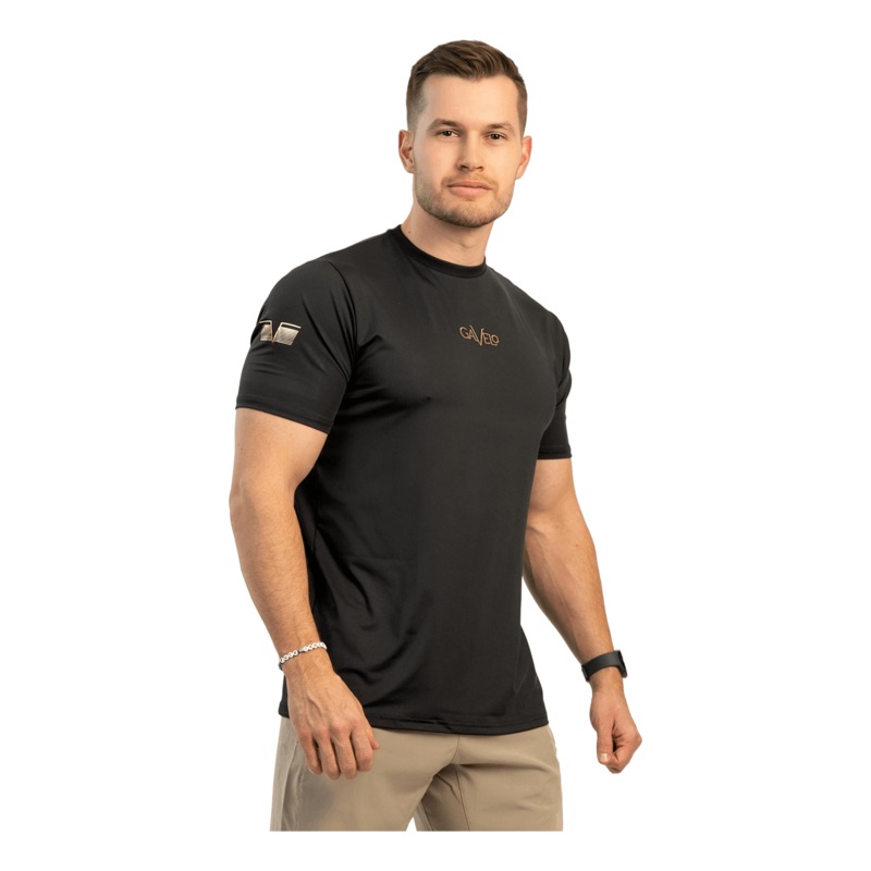 Svart Rashguard med guld Gavelo logotyp, tillverkad av hgkvalitativt funktionsmaterial. Designad fr att hlla dig sval och torr under intensiv trning, den erbjuder en smickrande siluett och optimal rrelsefrihet.