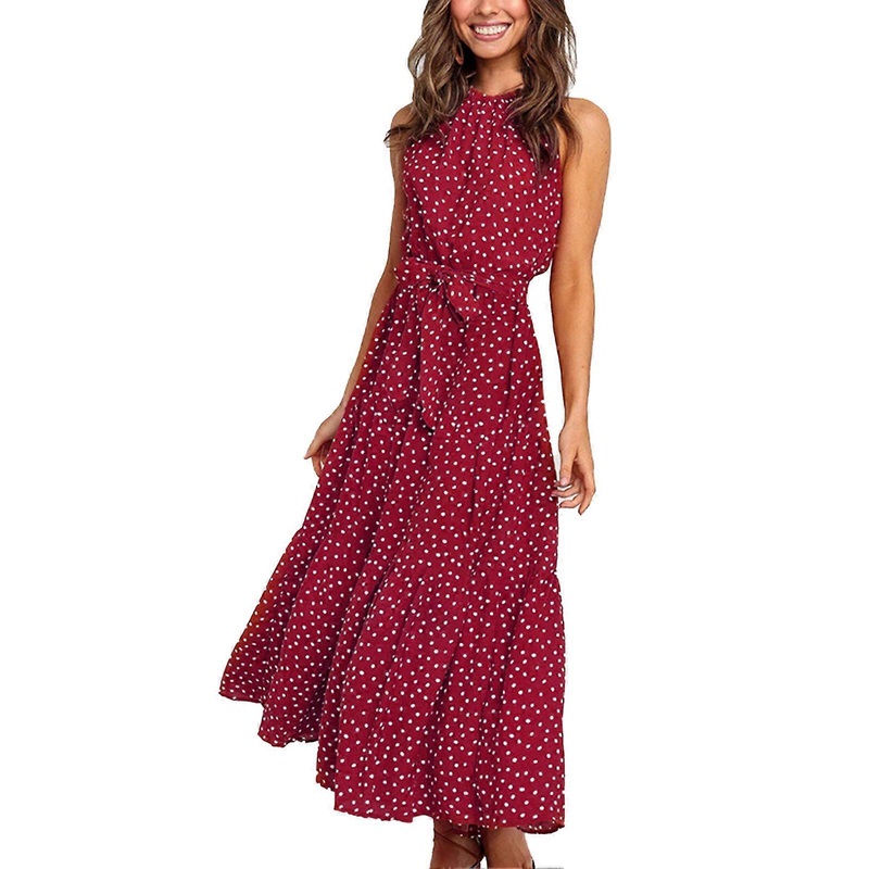 Description Item Type: Long dressMaterial: 95% Polyester, 5% PolyurethaneDetails: Women printed long dress, A line, halter neck, sleeveless maxi dress, belted bow tie, dot. Match: Match with sandals and high heels to make you beautiful and stylish.Suitable