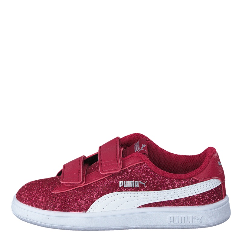 PUMA Smash v2 Glitz Glam ger en gnistrande effekt till alla sm damers skor och r utvecklingen av vrt framgngsrika Glitz Pack. Dess mjuka syntetiska ovandel med frbttrad passform hjlper de sm att rra sig hela dagen i komfort, medan det icke-mrkande gummit ger premiumgrepp fr vingliga ftter.