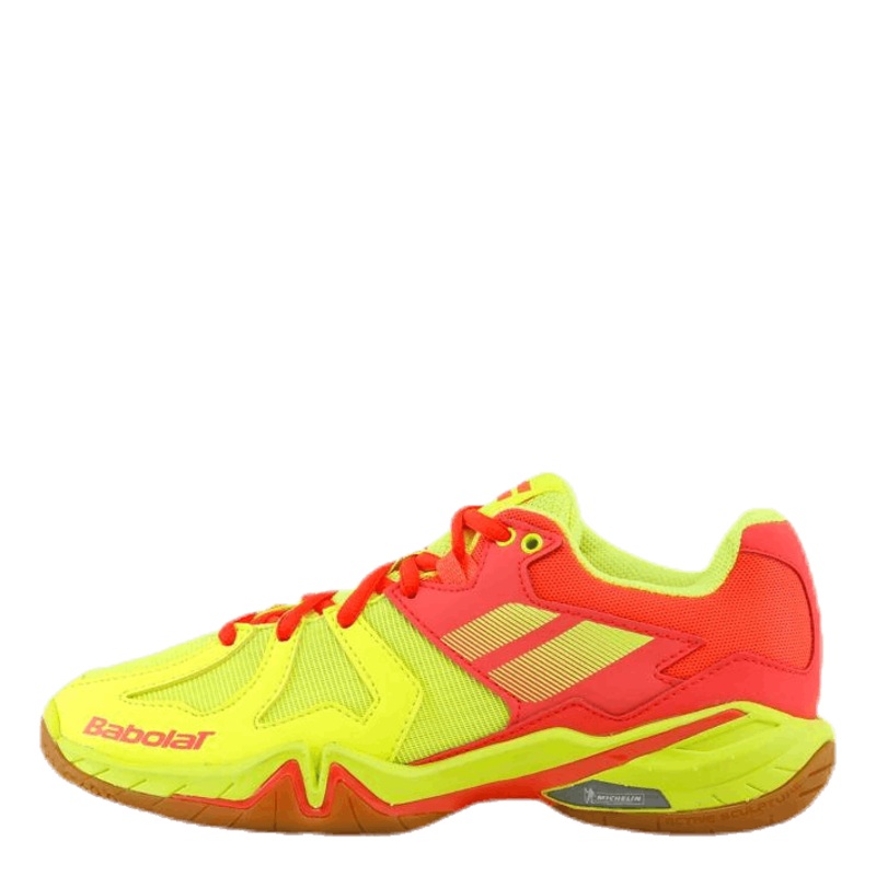 Babolat Shadow Spirit r en vldigt ltt och smidig sko fr badminton och andra inomhussporter. Ny frg fr 2019. Precis som Babolats dyrare modell s bjuder denna sko p stadig dmpning och ltt vikt kombinerat med bra grepp.Undersulan r utvecklad och tillverkad av Babolats samarbetspartner Michelin. 3D-formade dubbar i olika storlekar ger en optimal sula, strre dubbar bidrar med hllbarhet och extra bra grepp medan de mindre dubbarna kar friktionen. Explosivare startrrelser och snabbare stopp.Dmpningen r rejl och genomgende frn hlen till framfoten fr en stor komfort och minskade sttar.Ovansidan r tillverkad i ett slitstarkt mesh-material som andas och ventilerar skon fr att leda bort svett frn foten samtidigt som det r vldigt ltt fr att utka smidigheten.