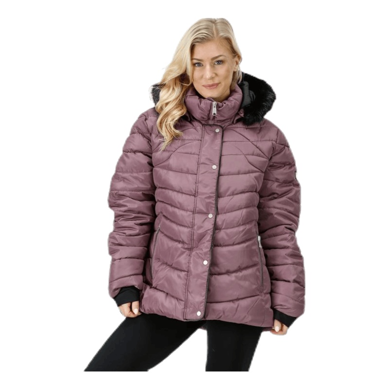 Denna vardagsjacka har ett riktigt stilrent utseende tack vare sitt glansiga material, de sneda kanalerna och den svarta avtagbara fuskplsen. Jackan r tillverkad i ett vattenavvisande material och har varm imitationsdunfyllning samt extra polyesterfyllning vid axelpartiet fr att hlla dig extra varm och torr. Den hga kragen skyddar dig vl mot vder och vind och tack vare den avtagbara huvan kan du effektivt stnga ute kyliga vindar. Vid rmsluten finns en innermudd i lycra fr bsta komfort.