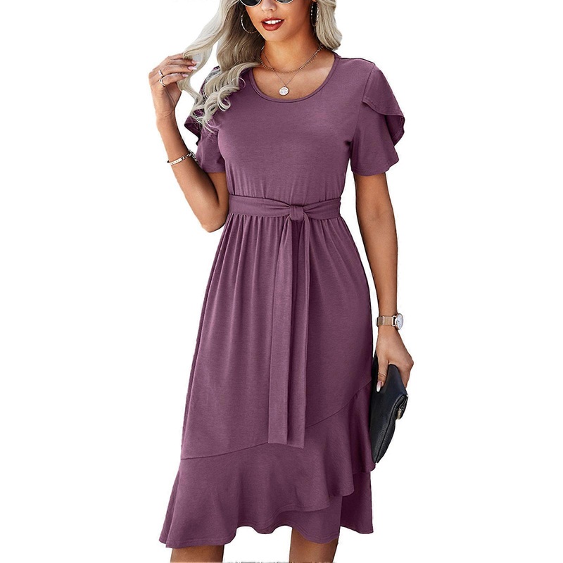 Short Sleeve Dress Elegant Women’s Spring Summer Round Neck Solid Color Tie Falbala Clothing Gray Purple L | Fruugo SG