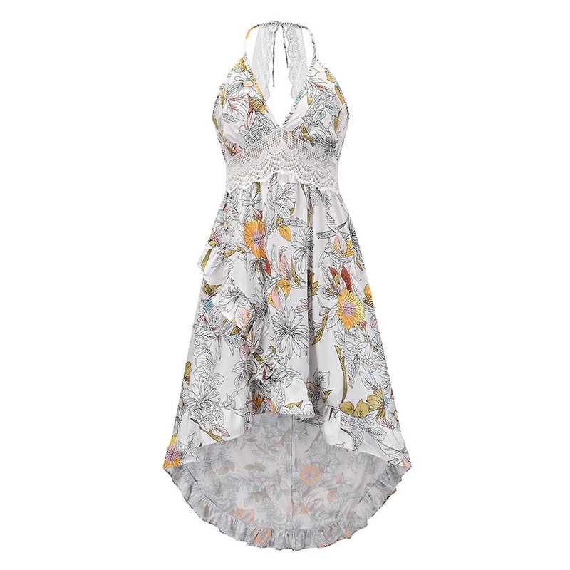 Description Item Type:SleevelessHalterNeckDressMaterial: PolyesterWashing Instructions: Machine washable, non bleachableFeatures:HalterdeepVneck,floralprinted,backlesslacestrap,highlowirregularruffle,tunic elastic waist