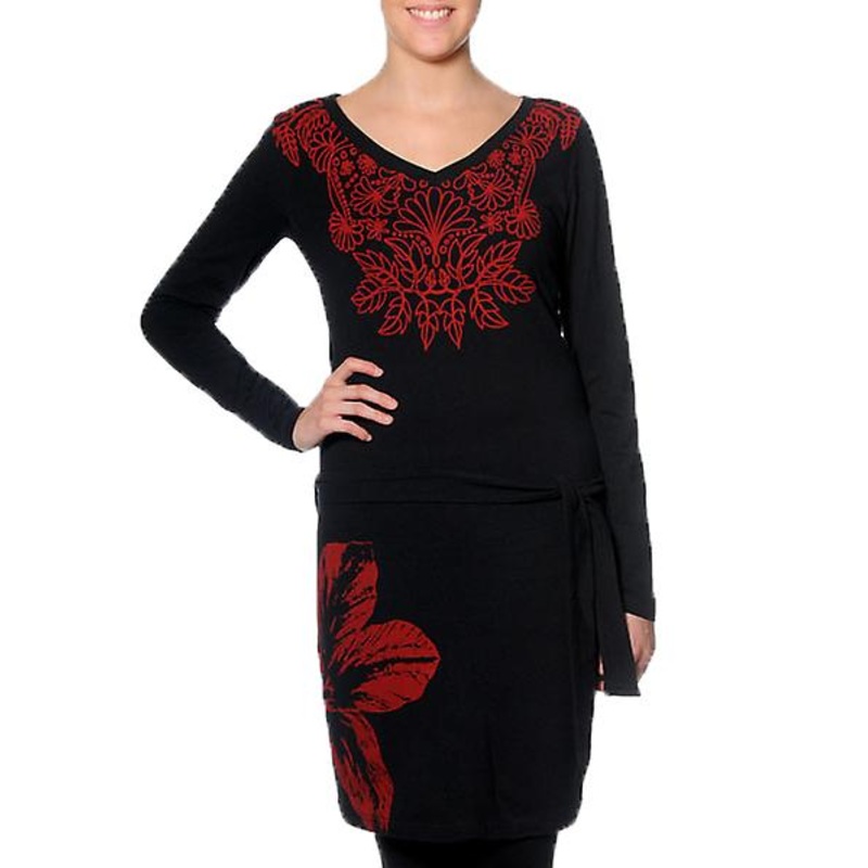 Description FANEGA Dress Stand out this season in a signature Smash design. Material composition: 97% COTTON 3% ELASTANE Flattering shape with V neck, low belt and slim shape in jersey fabric Design featuring black background with gorgeous oriental floral