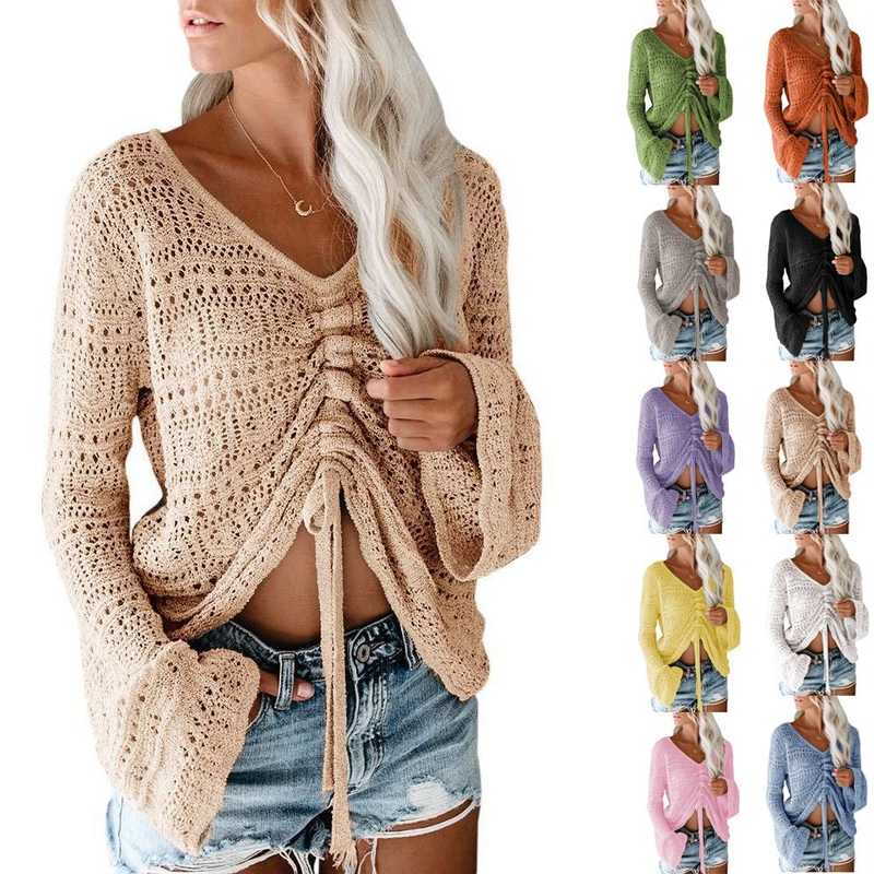 Solid Casual Trumpet Sleeve V-Neck Hollow Women Pullover Sweater – Womens Sweater and Women Spring Sweaters price