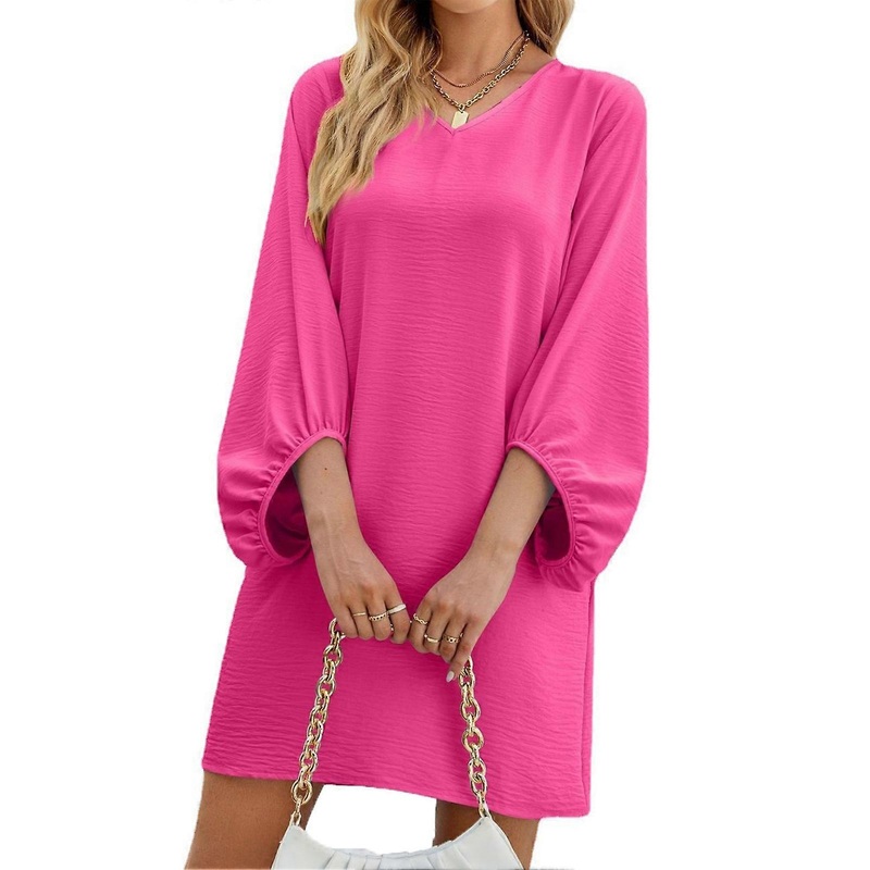 Description Item Type: Solid Color V Neck DressFabric: 100% PolyesterWashing Method: Machine WashFeatures: Solid Color, V Neck, 3/4Sleeves, Puff Sleeves, Fashion Casual DressMatching: Pair with Your Favorite Heels or Sneakers for a Feminine, Casual Look.Oc