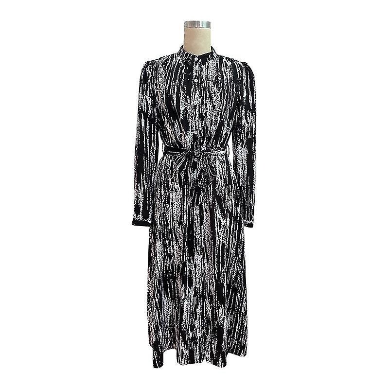 Gender: Women Item Type: Dress Style: Casual Pattern Type: Print Sleeve Length: Long Sleeve Dresses Length: Mid-Calf Material: Polyester 100% Neckline: Lapel Neck Closure Type: Button Fit Type: Slim Elasticity: Slight Strech Silhouette: Loose Decoration: None Waistline: Natural Sleeve Style: Regular Thickness: Standard Season: Spring, Summer Color: Black Size: S, M, L, XL Occasion: Family, Holiday, Employment Product Include: 1*Dress Label: Yes Washing Care: Hand wash cold, Ironing allowed, Dry clean, Gentle Wet Cleaning, Line dry in the Shade, Do not bleach Size Parameter: Size: S, Bust: 100 cm, Length: 125 cm, Waist: 106 cm, Shoulder: 36 cm, Sleeve: 63 cm, Hips: 104 cm Size: M, Bust:104 cm, Length: 127 cm, Waist: 110 cm, Shoulder: 37.5 cm, Sleeve: 64 cm, Hips: 108 cm Size: L, Bust: 110 cm, Length: 129 cm, Waist: 116 cm, Shoulder: 38.5 cm, Sleeve: 65.2 cm, Hips: 112 cm Size: XL, Bust: 116 cm, Length: 131 cm, Waist: 122 cm, Shoulder: 40 cm, Sleeve: 66.4 cm, Hips: 116 cm Attention