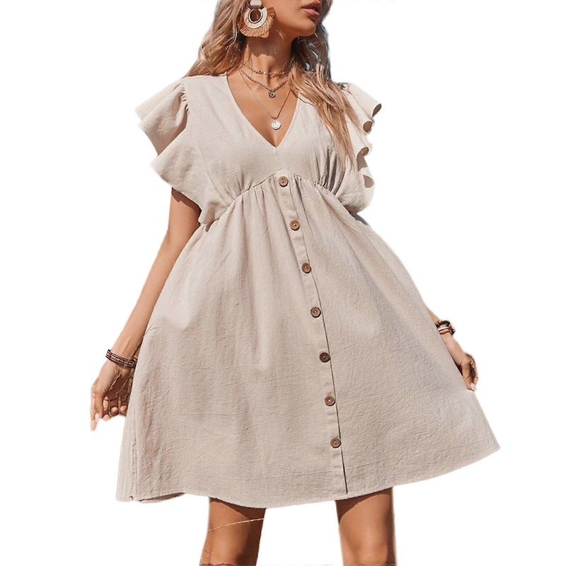 Stylish Ruffle Hem Mini-Beach Dress for Women Girl Spring Summer Dress Flowy V Neck Swing Dress Button Front Party Dress Khaki XS | Fruugo SG