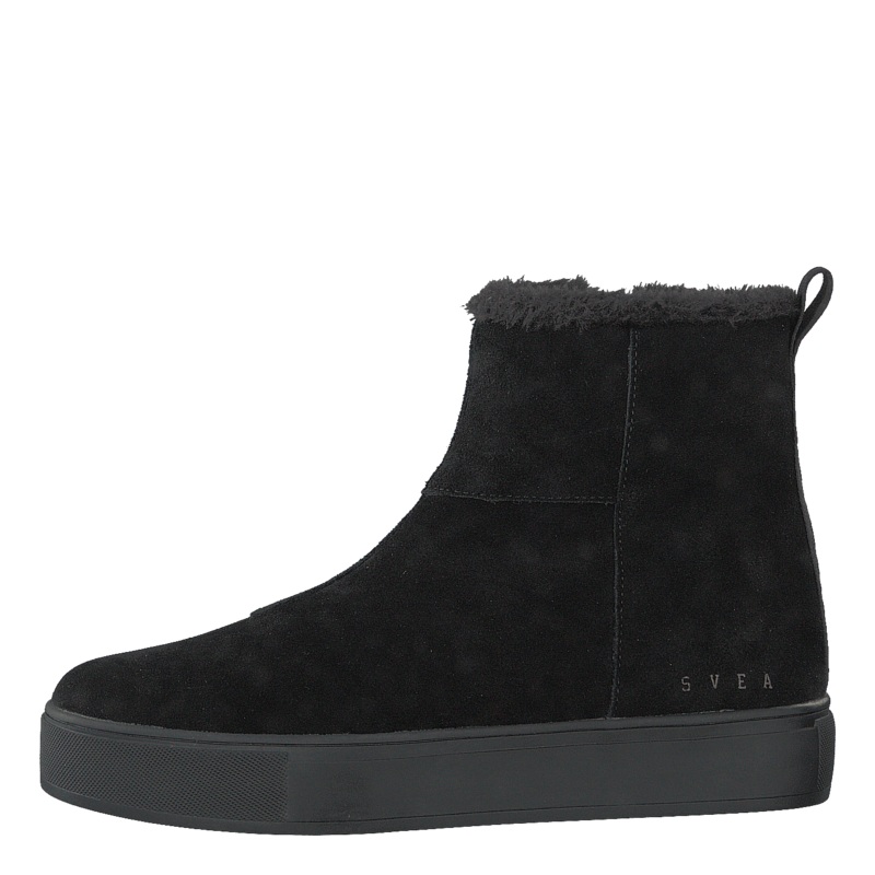 En varmfodrad knga i mocka med foder i lugg och sula i gummi. Har ett sveaband baktill och ett litet tryck p sidan.