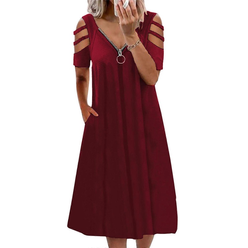 Description Features: Material: high-quality cloth, soft lining inside, not see through. Features: unique hollow out short sleeve design, zipper v neck, loose, solid color, flowy hem. This loose dress is a good choice in summer, you can match high heels to