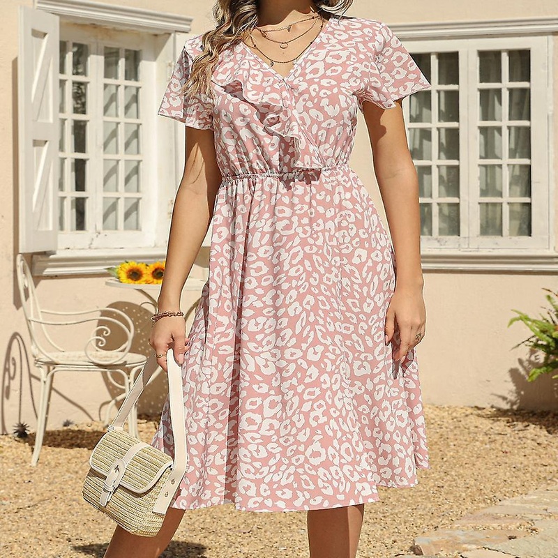 Summer V Neck Short Sleeve High Waist Causal Leopard Print Ruffle Beach Dress S-xxl | Fruugo SG