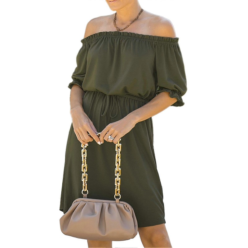 Item Type: Off shoulder dressMaterial: 100% PolyesterCare Instructions: Machine wash, do not bleachNeck Line: off shoulderDetails: Ruffle puff sleeve, frill trim, high waisted, drawstring waist. Suitable Scenes: Suitable for daily wear in summer, leisure, work, shopping, office, school, work, business, family, holidays, dating, beaches, indoor and outdoor activities.Size: Approx. S: Length: 86cm / 33.9in, Bust: 105cm / 41.3in, Hem: 118cm / 46.5in, Sleeve: 29.5cm / 11.6inM: Length: 87.5cm / 34.4in, Bust: 109cm / 42.9in, Hem: 122cm / 48in, Sleeve: 30cm / 11.8inL: Length: 89cm / 35in, Bust: 115cm / 45.3in, Hem: 128cm / 50.4in, Sleeve: 30.5cm / 12inXL: Length: 90.5cm / 35.6in, Bust: 121cm / 47.6in, Hem: 134cm / 52.8in, Sleeve: 31cm / 12.2in