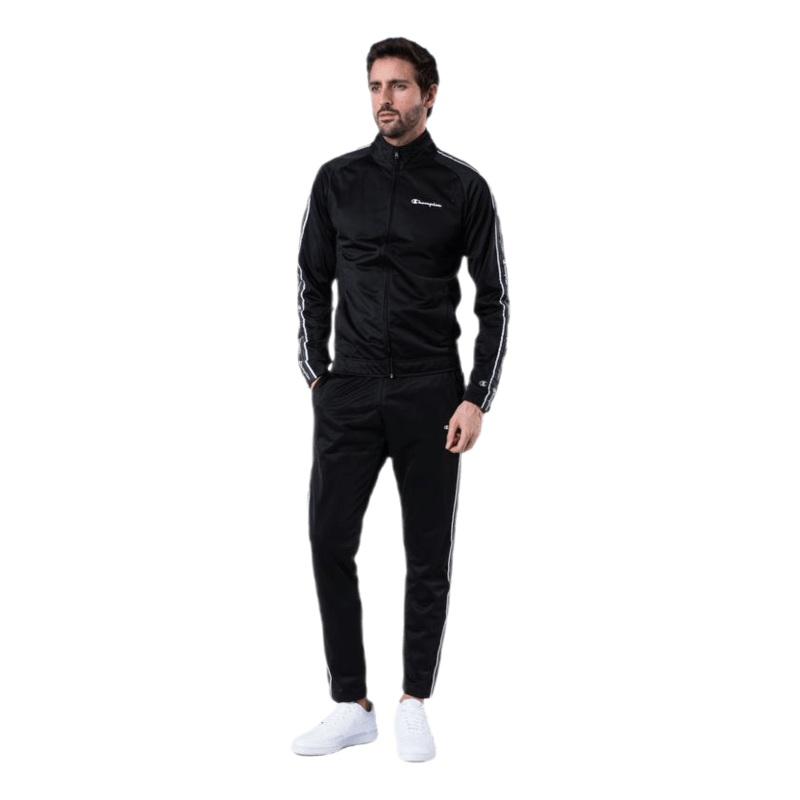 Tacksuit med byxa och jacka i 100%Polyester. Champion stripes p utsidan av rm och ben. Snrning i midja p byxa och hgre krage p jacka.