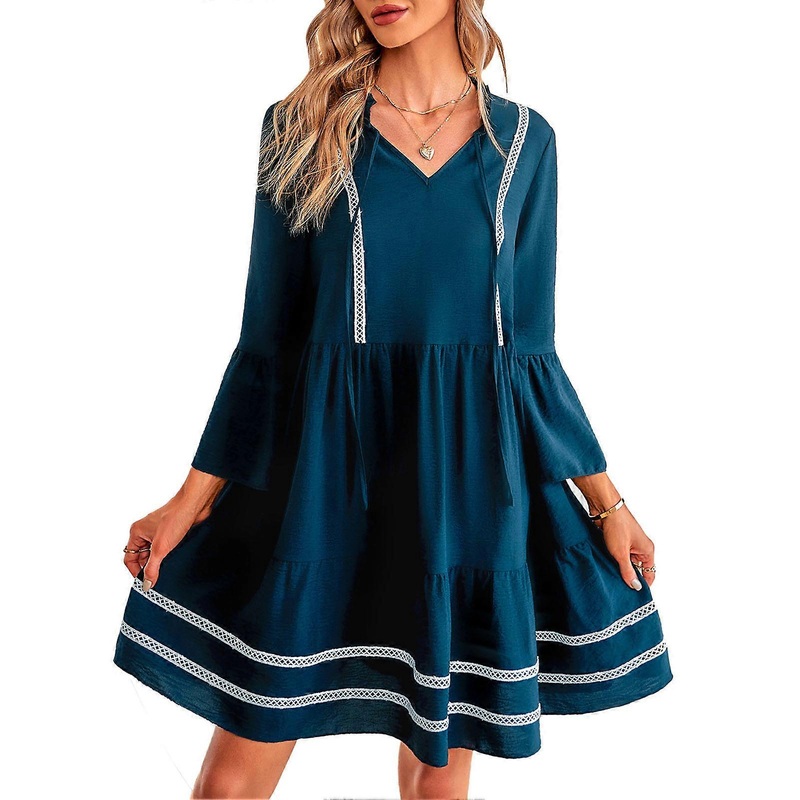 V Neck Ruffle Dress for Women Edge Tie Design Three Quarter Sleeve A Line Hem Breathable Womens Casual Dresses for Daily Life Royalblue M | Fruugo SG