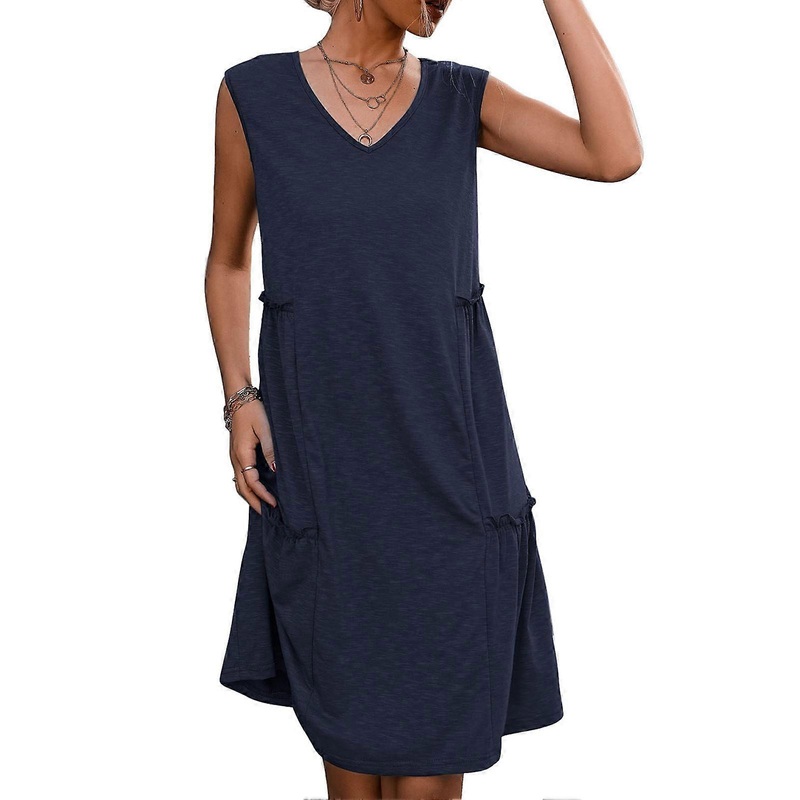 Description Item Type: Sleeveless DressMaterial: 95% Polyester Fiber, 5% PolyurethaneCleaning: Machine washStyle Characteristics: V neck, tank dress, frill trim design. Loose and casual.Scene: Suitable for summer everyday wear. Leisure, home, vacation, dat