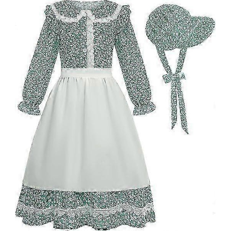 Complete set includes dress, apron, and matching bonnet Long-sleeve floral top with delicate lace trim and button-up front Classic white apron with gathered waist for an authentic pioneer look Soft, breathable fabric for all-day comfort Ideal for school plays, pioneer day celebrations, and costume parties