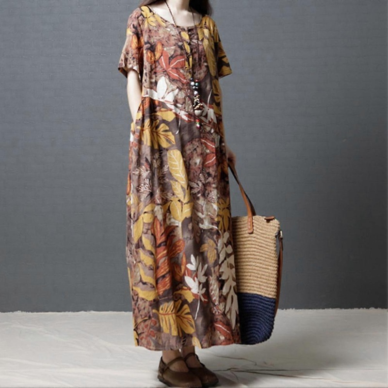 Vintage Women Summer Loose Long Dress Floral Print Pockets One-piece Dress(Coffee XL) | Fruugo SG