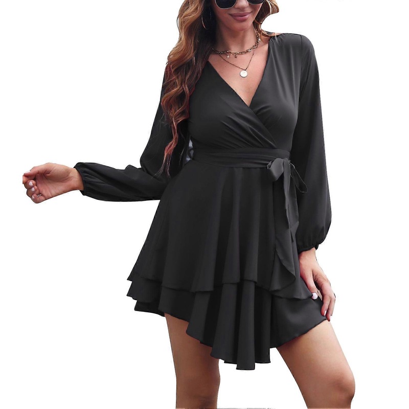Woman Wrap V Neck Short Dress Long Sleeve Tie Waist Casual Ruffle Tired Hem Flowy Swing Mini Dress Black M | Fruugo SG