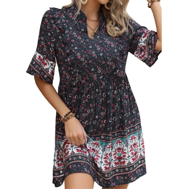 Description Features: Floral printed dress,stand collar, high waist,ethnic style, ruffle sleeve mid-length temperament dress adds some sexy and charm to you, and the dress perfectly shows your figure. Made of lightweight, skin friendly fabric, soft and com