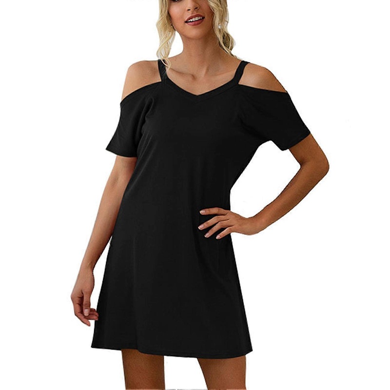 Women Cold Shoulder Dress Short Sleeve V Neck Pure Color Summer Casual Short Dress Black XL | Fruugo SG