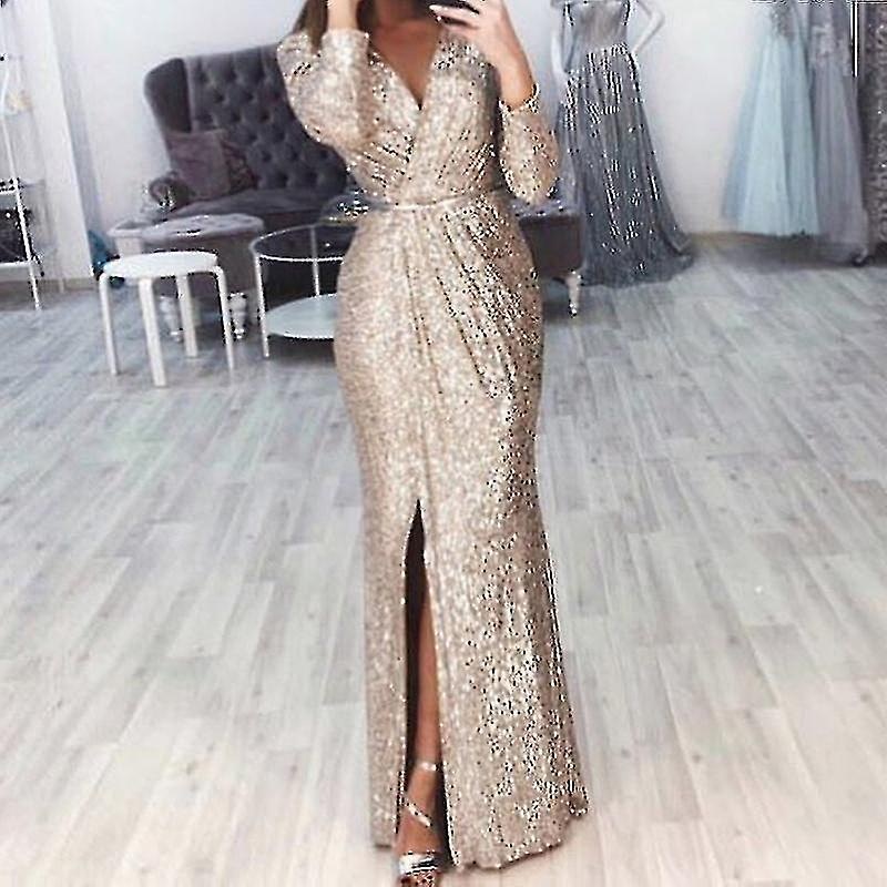 Women Deep V Neck Sequin Dress With Slit Long Sleeve Club Party Evening Dress For Women Lady New | Fruugo SG