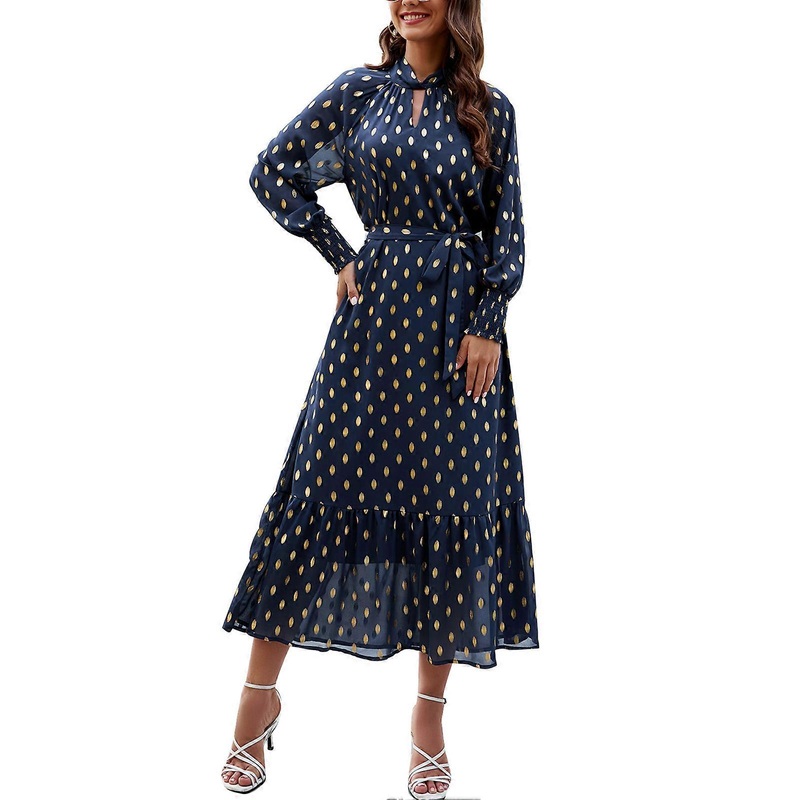 Description Item Type: DressMaterial: PolyesterCharacteristic: Knot cutout collar, back button collar desgin, lantern sleeves, shirred cuffs, loose ruffle hem dress, waist tie, gold dots printed dress.Scenes: This flowy pleated dress is perfect for party,
