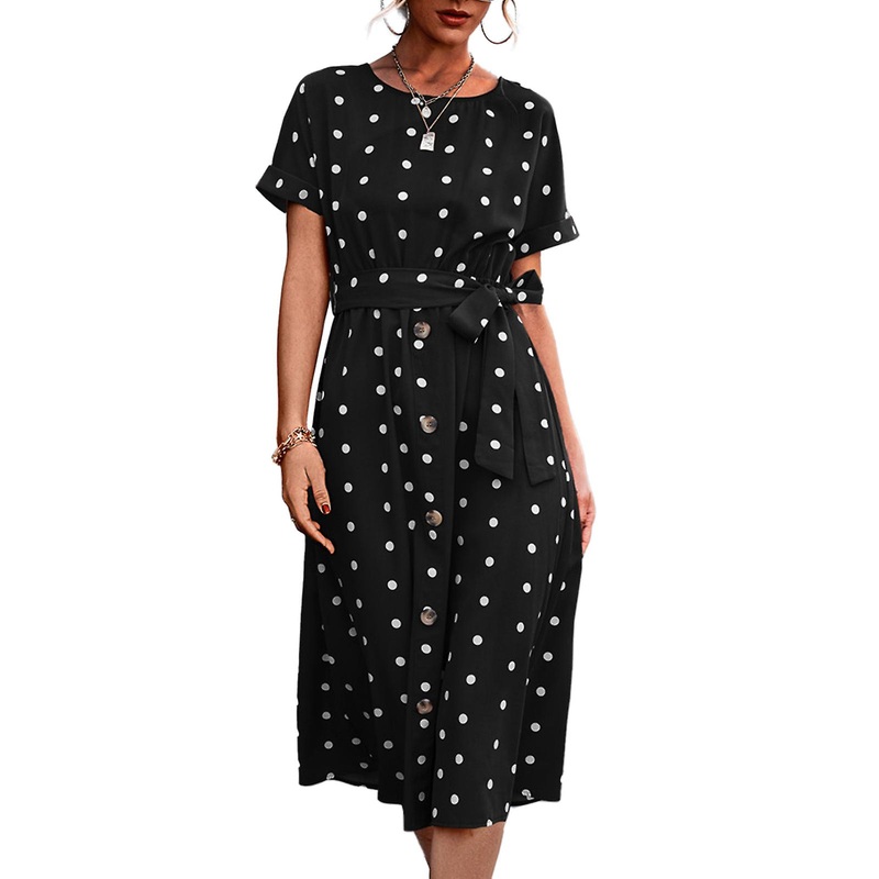 Style Characteristics: Round collar, short sleeves, dot printing, high waist, belted design for free to adjust the waist size. Button design. medium length dot print dress.