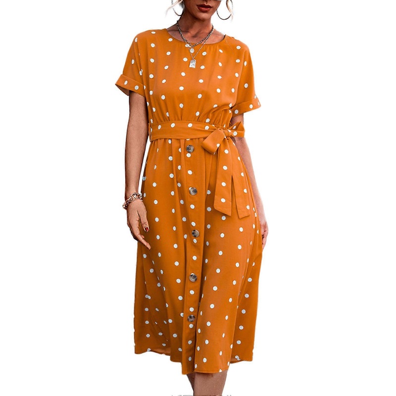 Item Type: Women Dots Print DressMaterial: 95% Polyester Fiber, 5% PolyurethaneCleaning: Machine wash, do not bleachStyle Characteristics: Round collar, short sleeves, dot printing, high waist, belted design for free to adjust the waist size. Button design. medium length dot print dress. Scene: Perfect for summer daily wear, such as parties, clubs, leisure, daily life, work, shopping, office, school, business, home, vacation, holiday, dating, beach, indoor and outdoor activities. Size:S: Bust: 114cm / 44.88in, Waist: 64cm / 25.20in, Length: 114cm / 44.88in, Weight: 220g / 7.76oz.M: Bust: 118cm / 46.46in, Waist: 68cm / 26.77in, Length: 115.5cm / 45.47in, Weight: 230g / 8.11oz.L: Bust: 122cm / 48.03in, Waist: 72cm / 28.35in, Length: 117cm / 46.06in, Weight: 240g / 8.47oz.XL: Bust: 126cm / 49.61in, Waist: 76cm / 29.92in, Length: 118.5cm / 46.65in, Weight: 250g / 8.82oz.