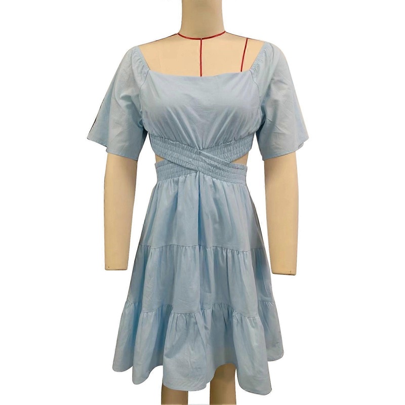 Description Item Type: Women Summer DressMaterial: CottonStyle: Bell sleeves, back pleated, ruffle hem. Sweet and casual, exaggerated sleeves, the upper body has hollow details. Ruffle hem style, pleated crossing belt, low back design.Scene: Suitable for a