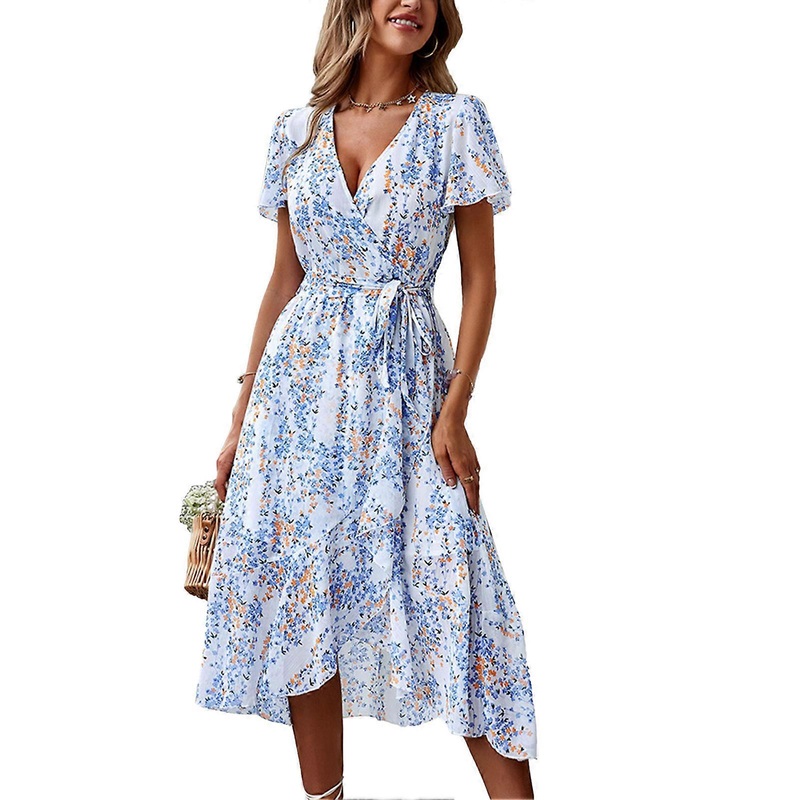 Item Type: Women DressMaterial: PolyesterStyle: Lightweight and breathable fabric, this printed dress is made of comfortable and lightweight polyester, providing you with a cool and comfortable wearing experience. Light but not sheer, this dress is not heavy even in sweltering weather. Short sleeved swing dresses are definitely a summer wardrobe staple. Design: Printed women dress, short sleeve, ruffle hem A line, high waist, layered, belted, lightweight chiffon maxi dresses, for summer, beach, etc. Features Provides you with a soft and comfortable touch that is skin friendly. The highlight of the dress is the prints that compliments your beauty. Showing off your collarbone in this swingy summer dress with a crossover V neck. A line swing dress with a belt that adjusts to your comfort level. Matching: The printed tiered maxi dress can be worn with heels, boots or sandals for a stylish look. You can also match it with a brim hat to show your generosity. This flared dress is perfect for everyday, dating, shopping, office, beach, vacation, party, etc. This elegant layered dress is a must have in your wardrobe. Size: Approx. S: Length: 124cm / 48.82in, Bust: 96cm / 37.8in, Waist: 65cm / 25.59in, Shoulder: 37cm / 14.57in, Sleeve: 20cm / 7.87inM: Length: 126.2cm / 49.69in, Bust: 101cm / 39.76in, Waist: 70cm / 27.56in, Shoulder: 38.5cm / 15.16in, Sleeve: 20.5cm / 8.07inL: Length: 128.4cm / 50.55in, Bust: 108cm / 42.52in, Waist: 77cm / 30.31in, Shoulder: 40.5cm / 15.94in, Sleeve: 21.2cm / 8.35inXL: Length: 130.6cm / 51.42in, Bust: 115cm / 45.28in, Waist: 84cm / 33.07in, Shoulder: 42.5cm / 16.73in, Sleeve: 21.9cm / 8.62inXXL: Length: 132.8cm / 52.28in, Bust: 122cm / 48.03in, Waist: 91cm / 35.83in, Shoulder: 44.5cm / 17.52in, Sleeve: 22.6cm / 8.9in