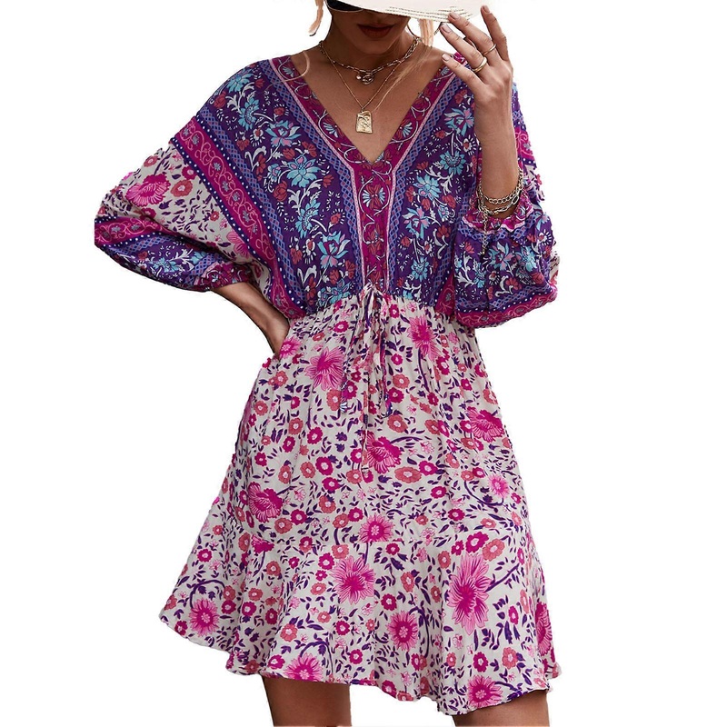 Women Floral Printed Dress V Neck Long Puff Sleeves Back Strap Elastic High Waist Summer Short Dress Purple XL | Fruugo SG