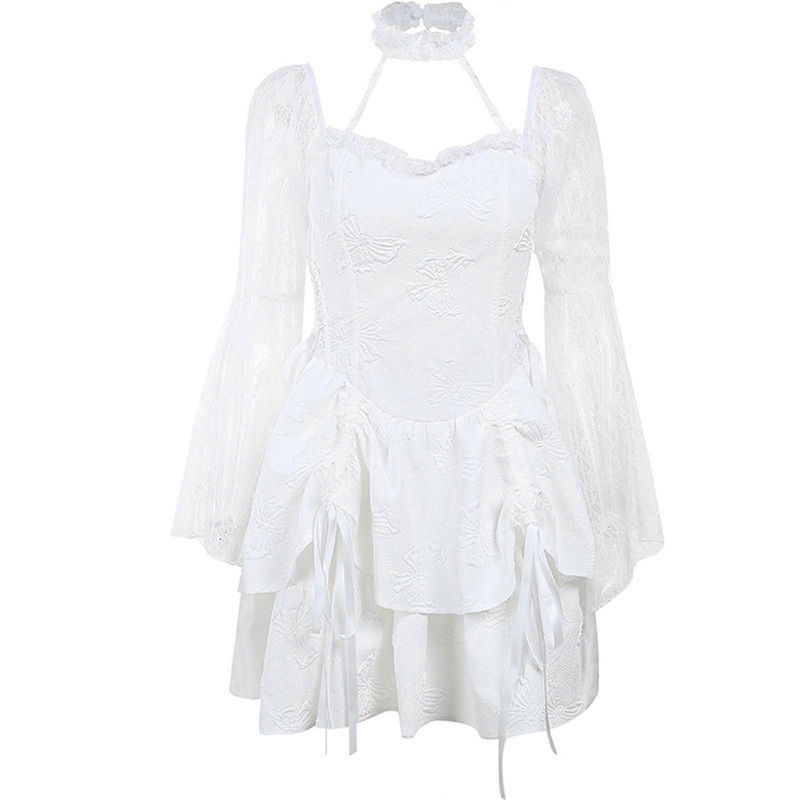 Description Features: brand new and high quality Made of quality polyester material, breathable, skin-friendly, soft and comfortable to wear. Lace flared long sleeve, ruffled halter collar, zipper up closure design at back, A-line style. Gothic punk style,