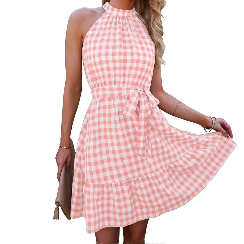 Women Halter Neck Sleeveless Plaid Dress One Piece Ruffle Flowy Hem Key Hole Back High Waist Line with Belt Pink S | Fruugo SG