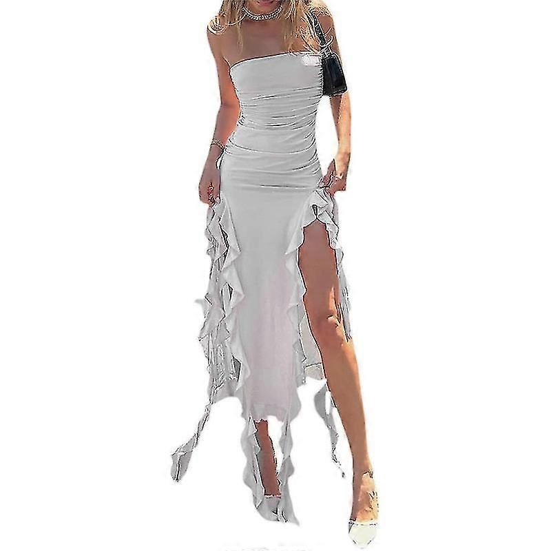 Description Soft Material: strapless dress for women are made of polyester, soft, comfortable, breathable and lightweight, making you elegant and sweet. Attractive Designs: Long summer dress for women, solid color, irregular ruffled hem, ruched, slim fit,