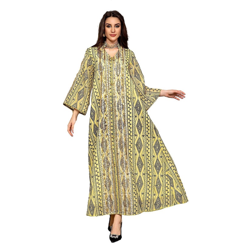 Women Kaftans Abaya Dress V Neck Sequins Dress Embroidery Kaftans Abaya Dress Full Length Kaftan Abayas Casual Dress Yellow XL | Fruugo SG